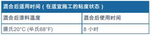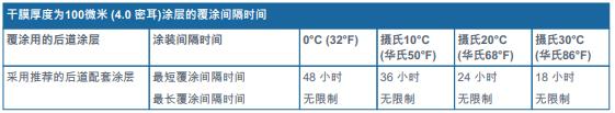 -對(duì)于進(jìn)行自身覆涂以期達(dá)到規(guī)定干膜厚度要求時(shí), 建議在2天時(shí)間內(nèi),須于涂層完全固化前完成。對(duì)于自身覆涂而言, 則沒(méi)有最短覆涂間隔時(shí)間的限制規(guī)定。